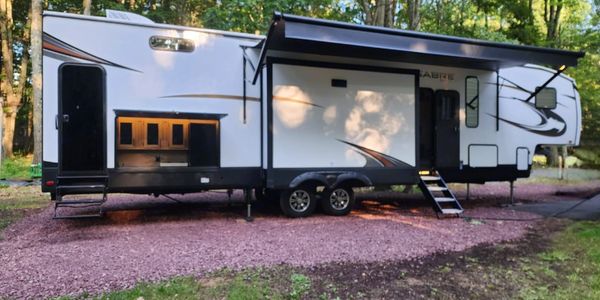Forest River Sabre 38DBQ - This luxury 43-foot fifth wheel represents the pinnacle of comfort and convenience. Designed for families and groups up to 8 guests, this spacious unit features: